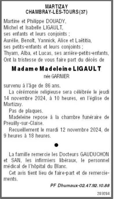 Décédée à Le Blanc (36300, France) le vendredi 8 novembre 2024 à l'âge de 86 ans