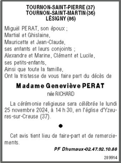 Décédée à Tournon-Saint-Pierre (37290, France) le mercredi 20 novembre 2024 à l'âge de 82 ans