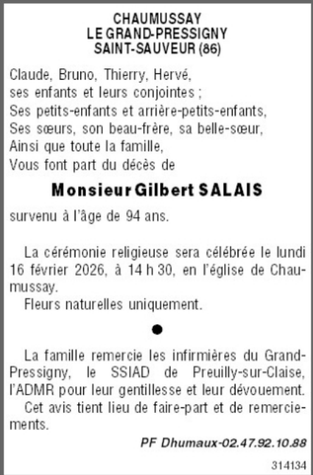 Décédé à Châtellerault (86100, France) le lundi 9 février 2026 à l'âge de 94 ans