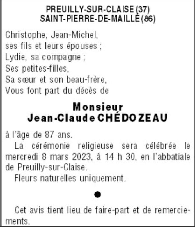 Décédé à Châtellerault (86100, France) le vendredi 3 mars 2023 à l'âge de 87 ans