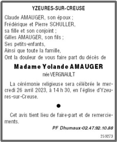 Née à Yzeures-sur-Creuse (37290, France) le lundi 29 juillet 1935