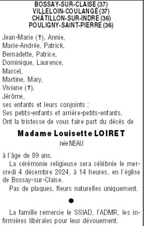 Décédée à Loches (37600, France) le dimanche 1 décembre 2024 à l'âge de 89 ans