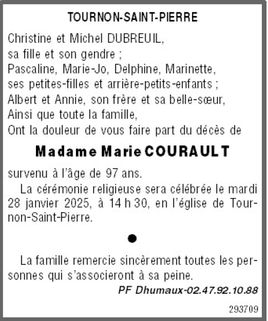 Décédée à Tournon-Saint-Martin (36220, France) le mercredi 22 janvier 2025 à l'âge de 97 ans