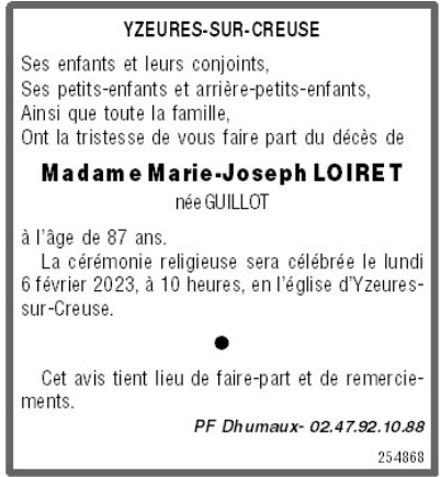 Décédée à Saint-Cyr-sur-Loire (37540, France) le jeudi 2 février 2023 à l'âge de 87 ans