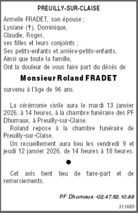 Décédé à Preuilly-sur-Claise (37290, France) le mardi 6 janvier 2026 à l'âge de 96 ans