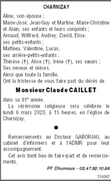 Décédé à Charnizay (37290, France) le mercredi 1 mars 2023 à l'âge de 90 ans